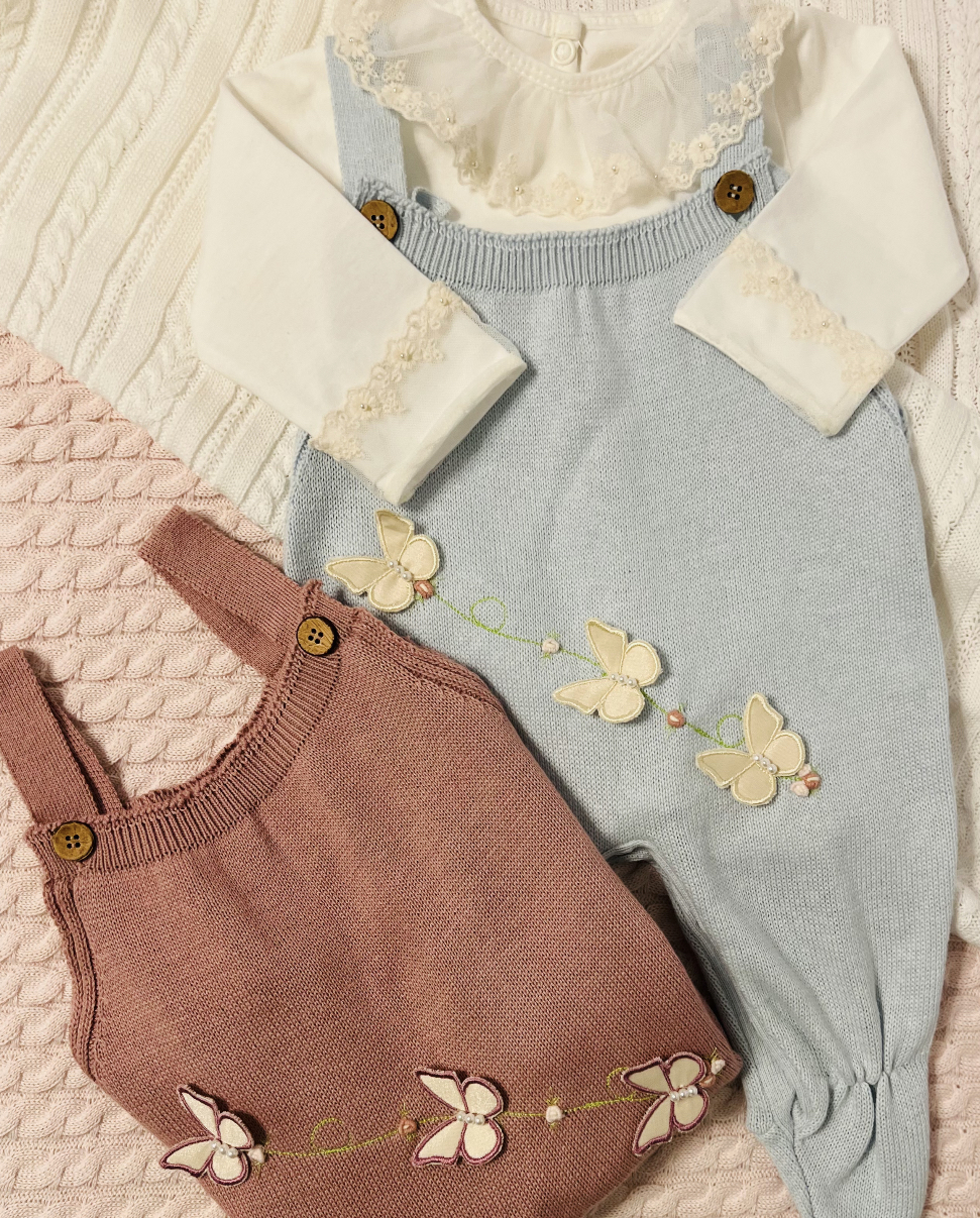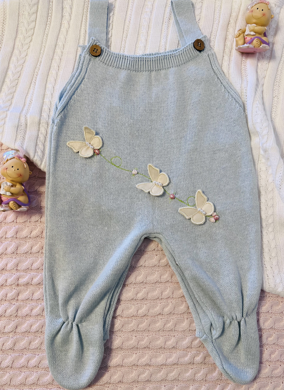 Jardineira com pézinho e aplicações em borboleta 3D com pérolas e bordado rococó manual.
