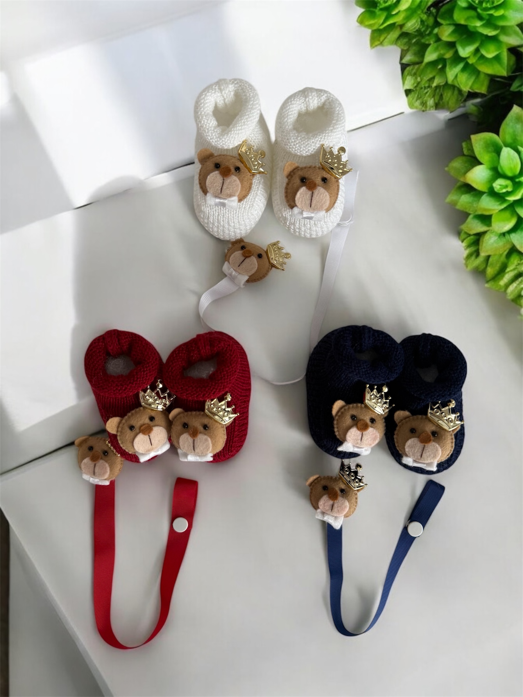 Kit composto por sapatinho com ursinho + prendedor de chupeta.
