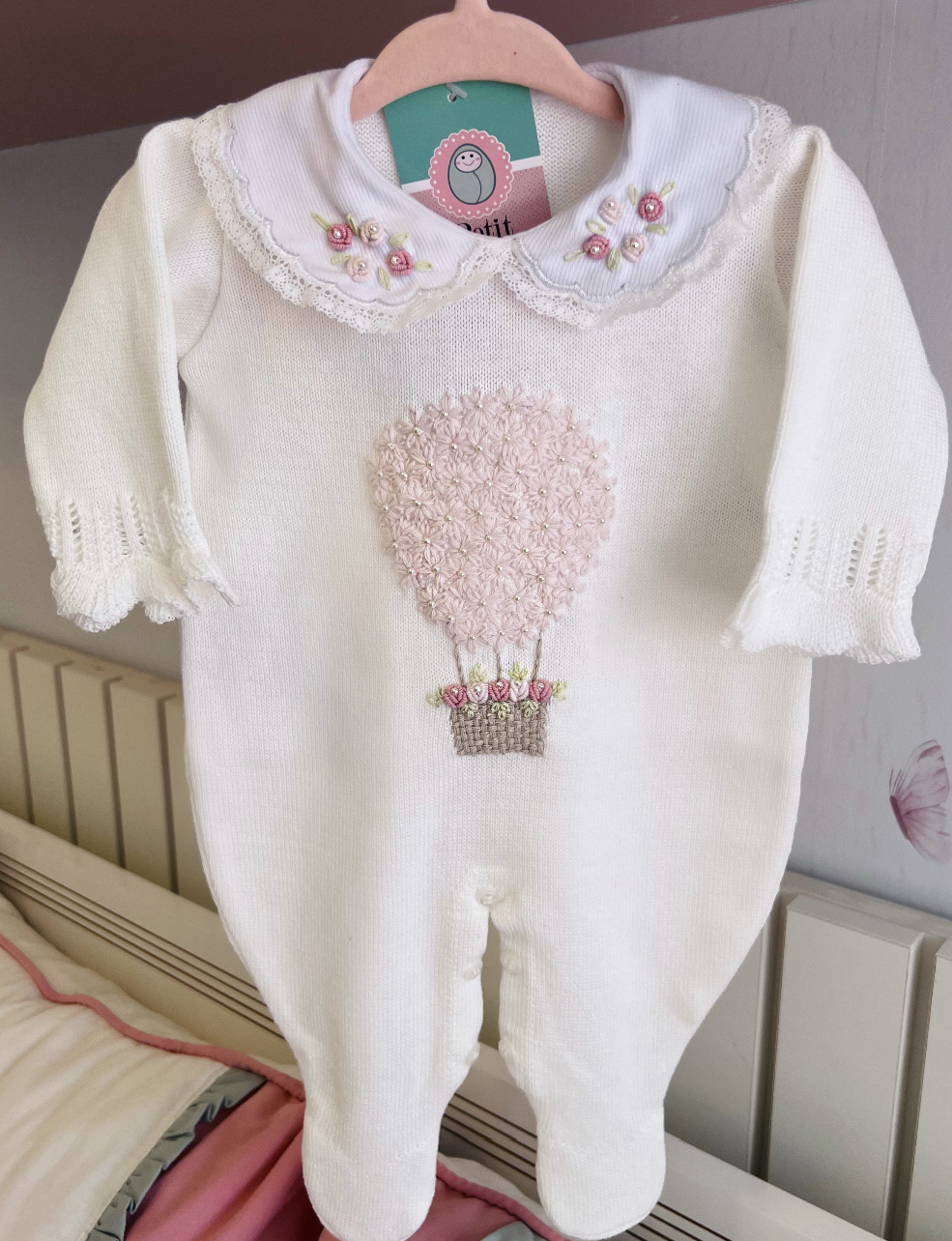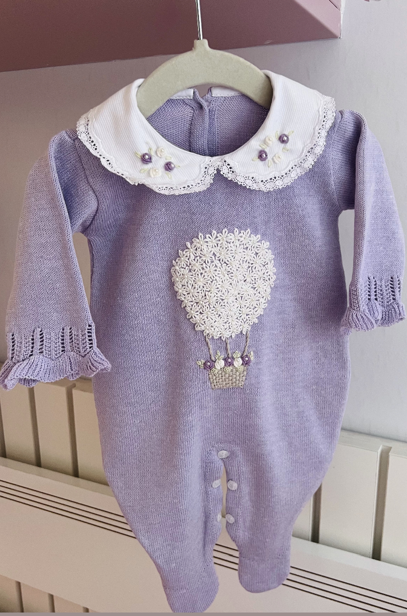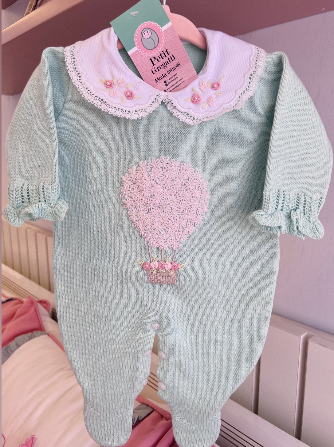 Macacão Balão Mágico todo bordado à mão com gola fixa também bordada.