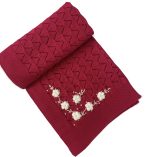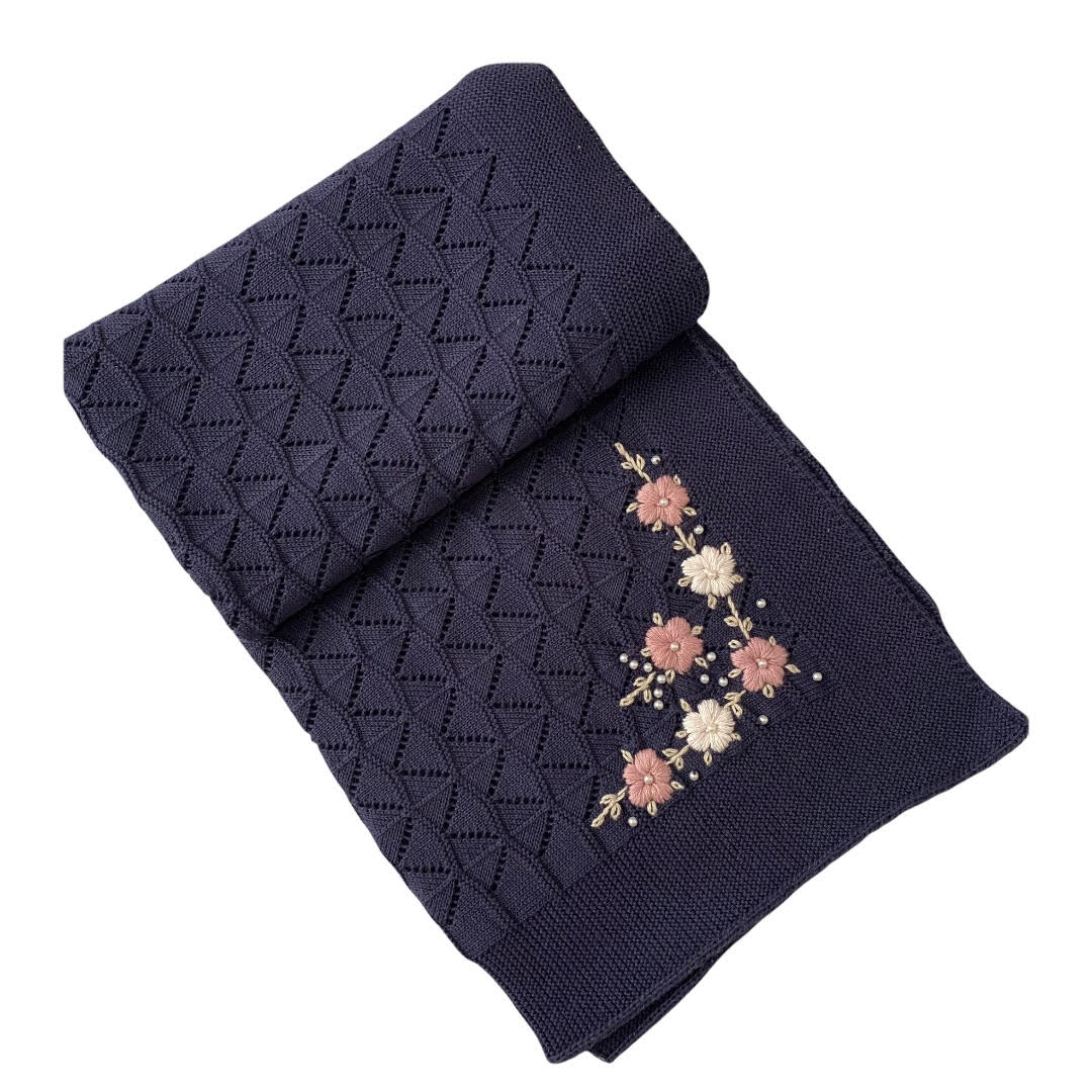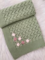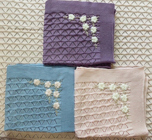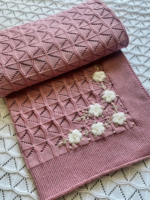 Manta 85cm x 85cm composta de linha mista 50% algodão e 50% acrílico.