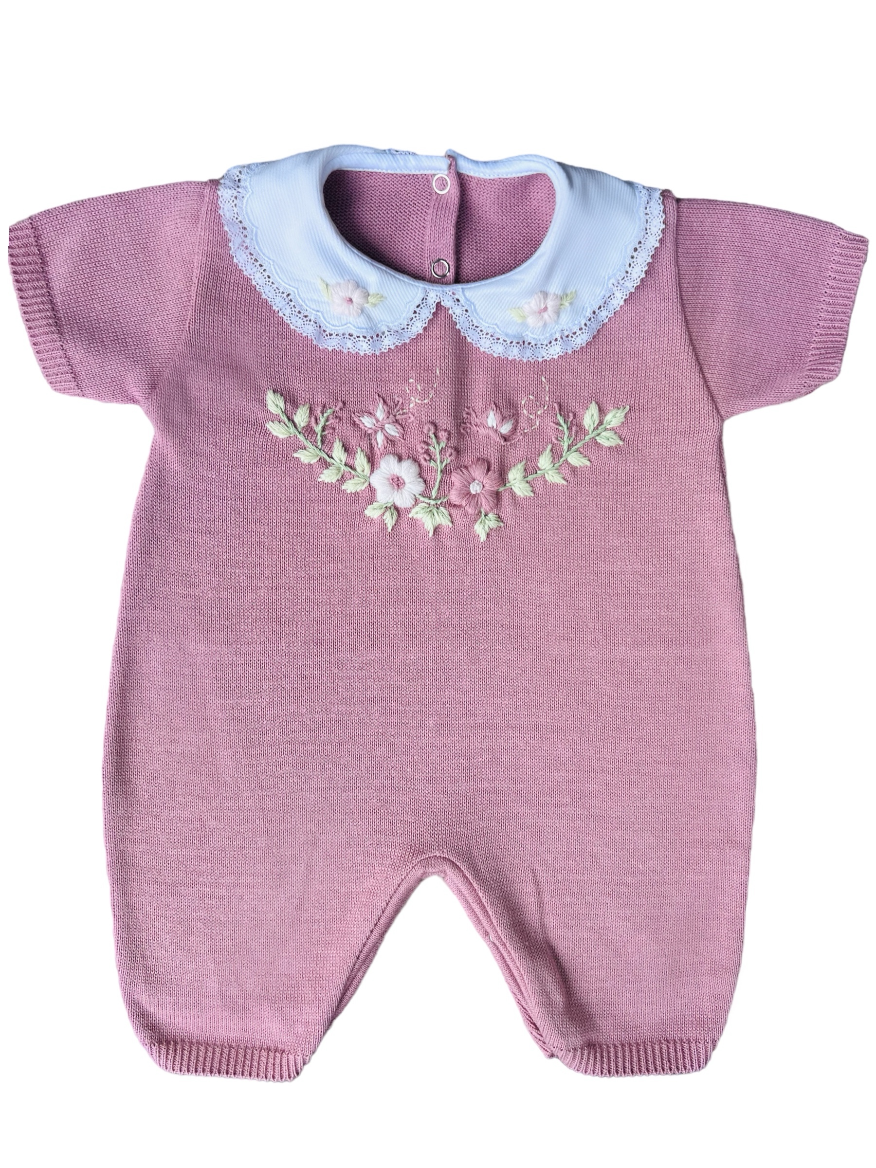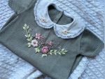 Macacão curto (romper) bordado flores e borboletas à mão com manga curta e gola fixa bordada também à mão.