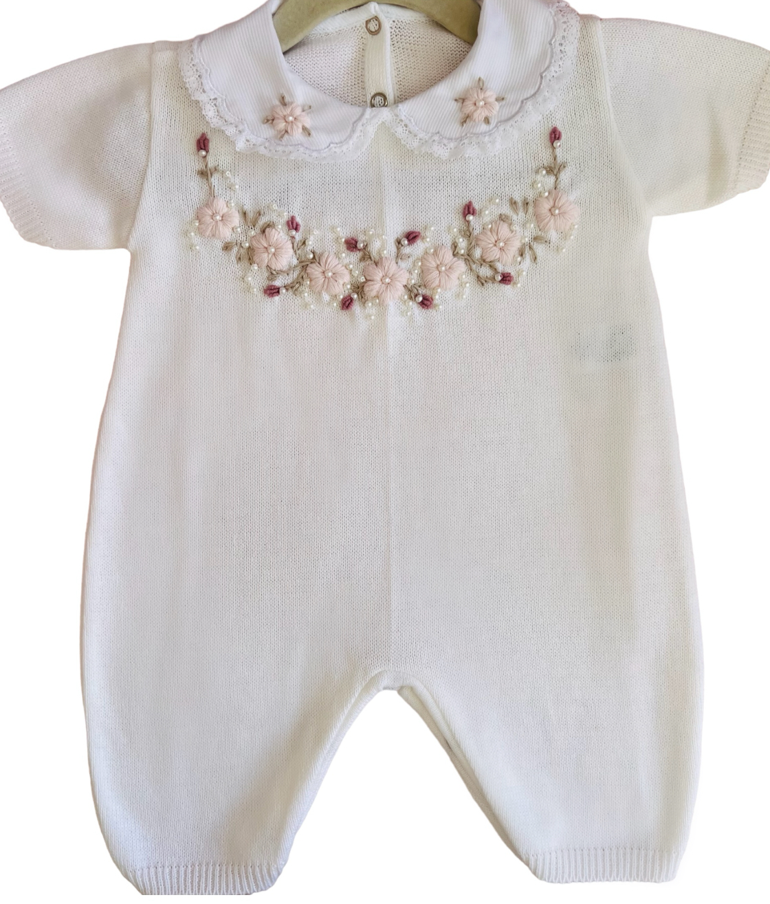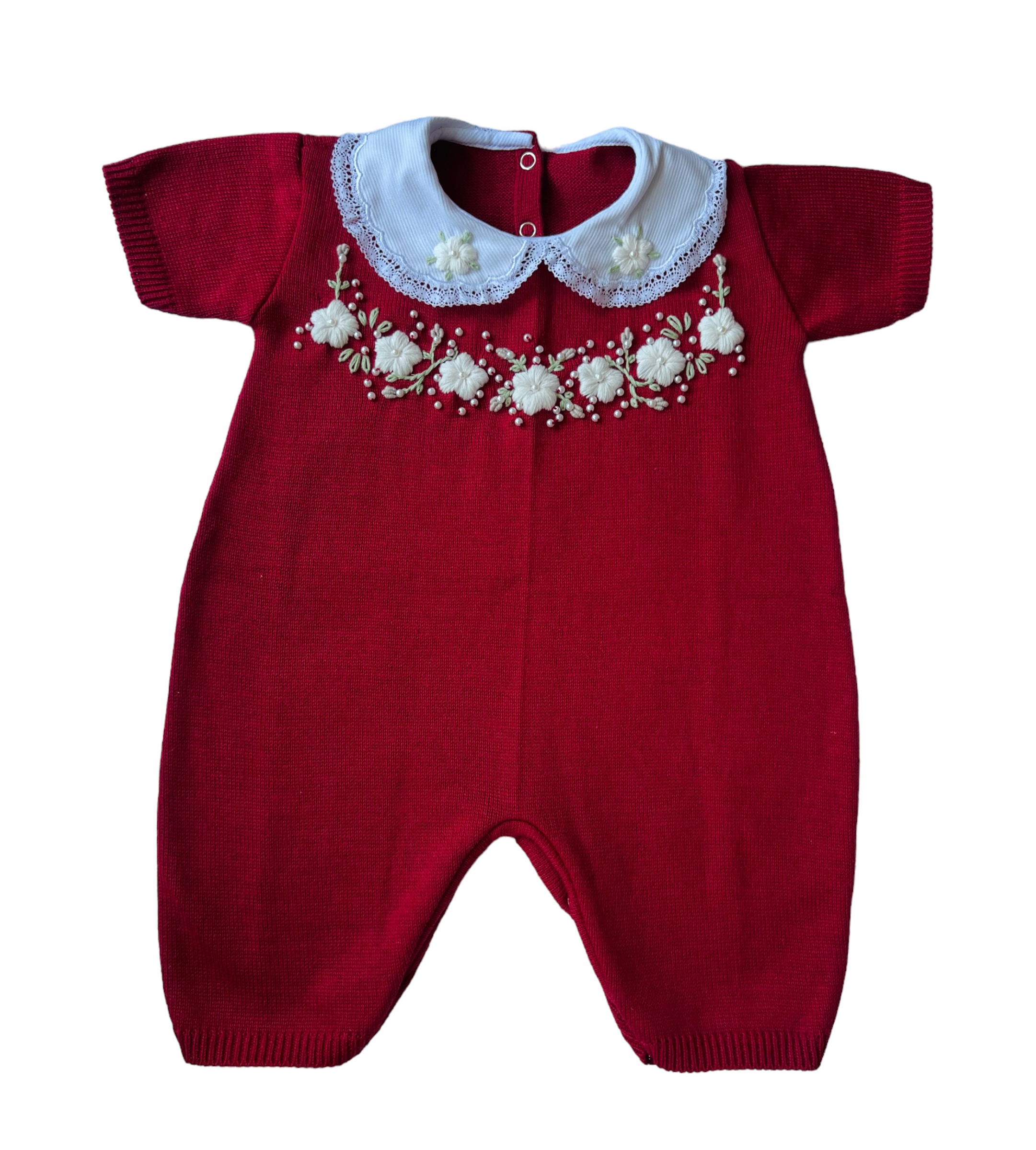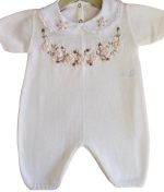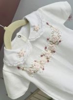 Macacão curto (romper) bordado flores à mão com manga curta e gola fixa bordada também à mão.