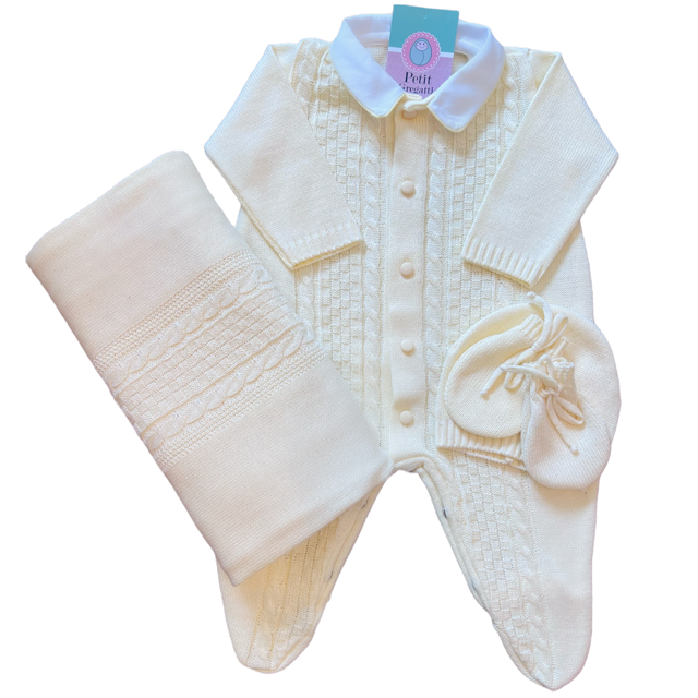 Saída maternidade composta por macacão com gola fixa + manta + kit touca e par de luvas. Produto feito de 50% algodão e 50% acrílico.