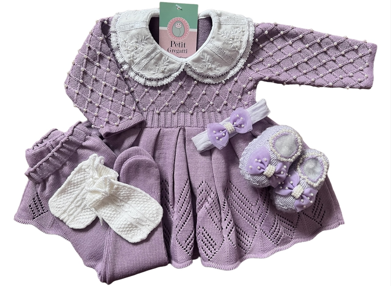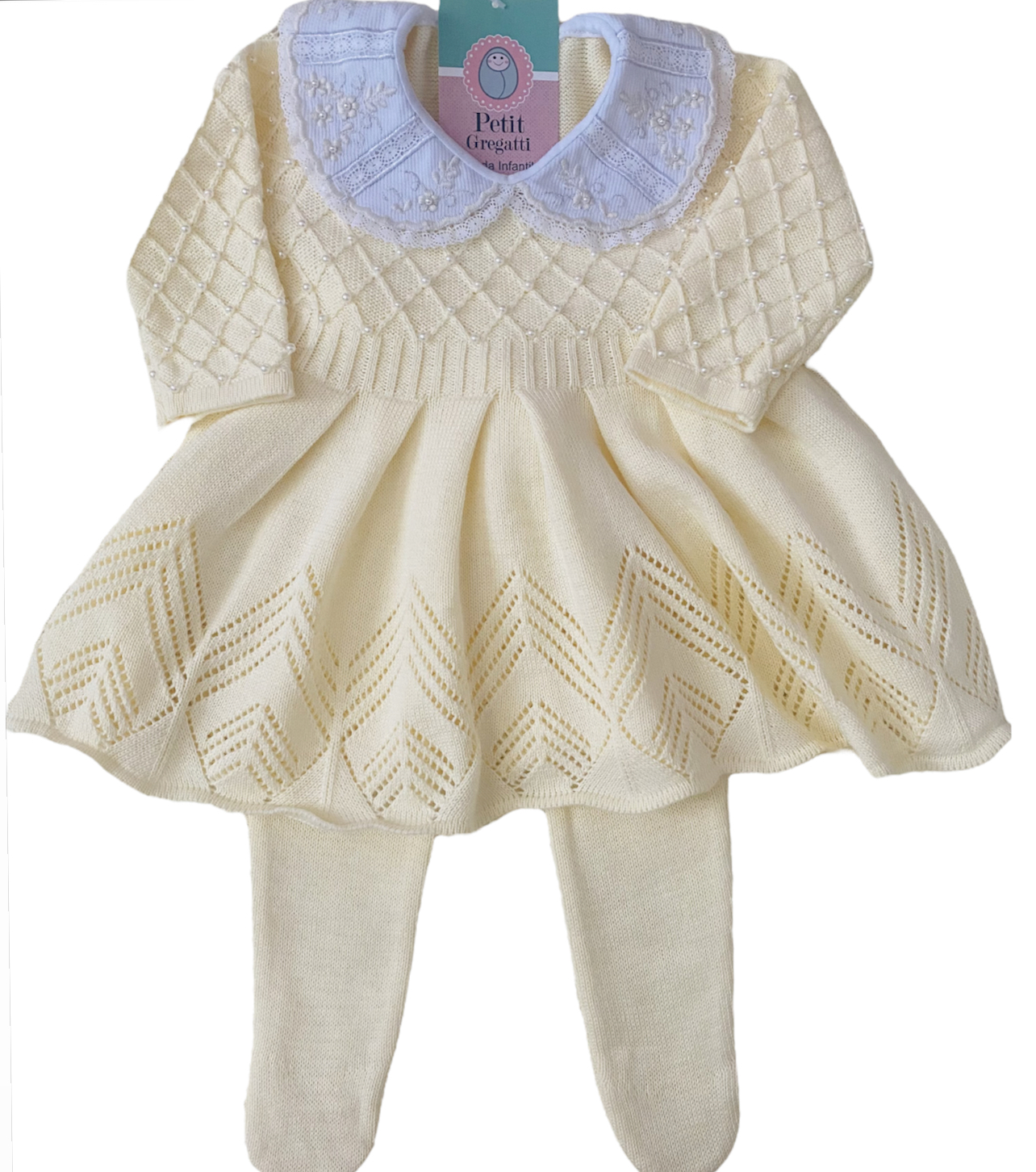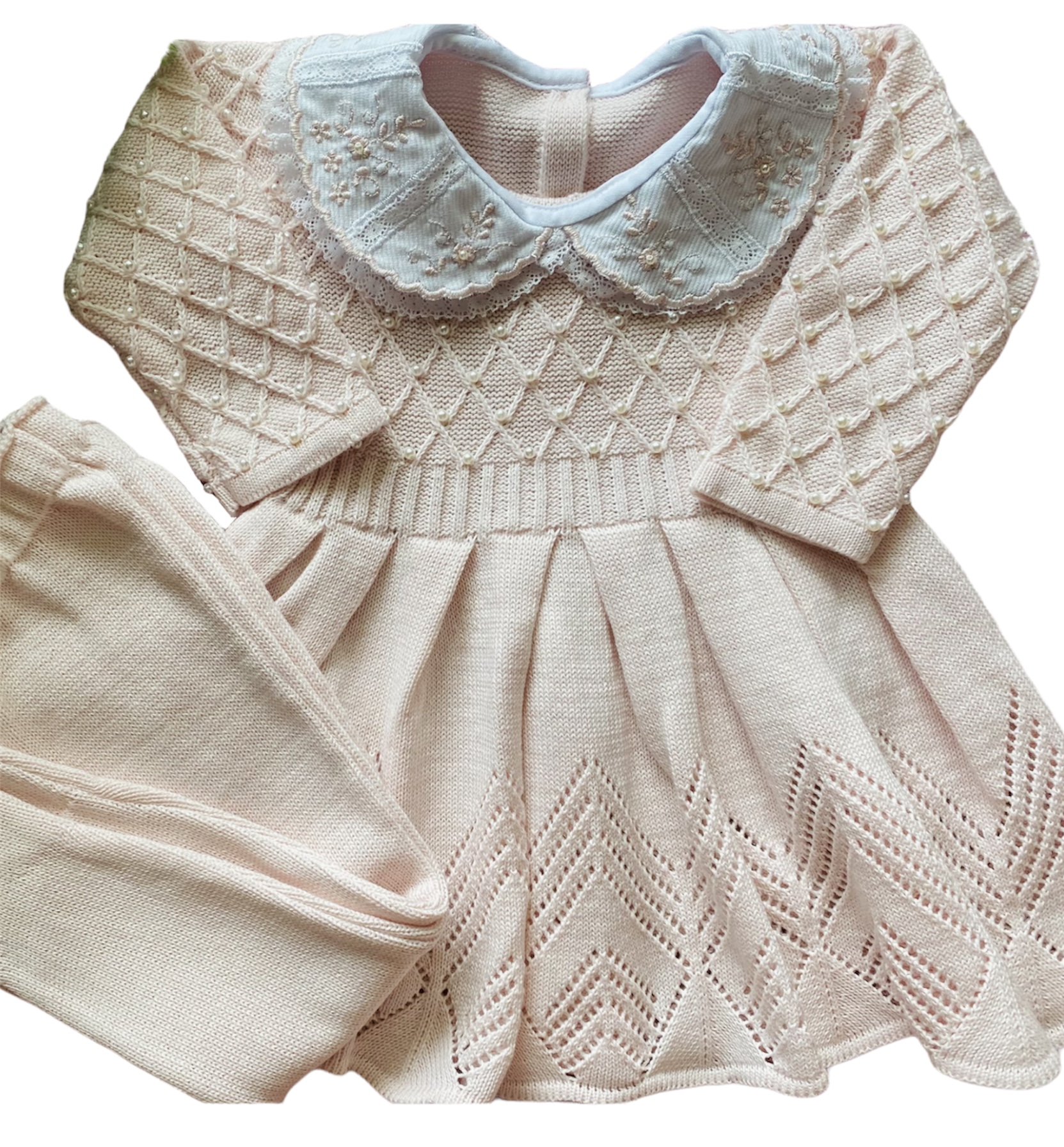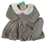 Vestido com pérolas bordadas à mão com gola fixa rendada e também bordada bordada com pérolas + Calça. A linha mista de acrílico e algodão é ideal para o bebê pois é antialérgica e térmica. Se adapta perfeitamente a temperatura necessária para o bebê.