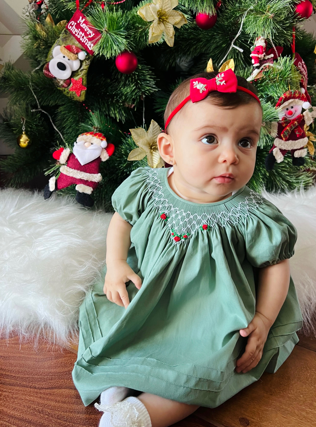 Vestido verde oliva 100% algodão com bordado casa de abelha e calcinha combinando.
